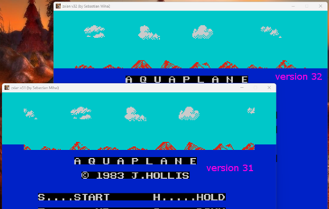 In Aquaplane, precise timing changes the border from cyan to blue partway through the screen drawing. This splits the border into "sky" and "water" partitions. In zxian version 31, the CPU was not contended, and thus ran too fast. This results in the border changing from "sky" to "water" too soon, resulting in more "water" than intended.