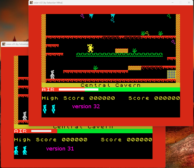 Manic Miner has run significantly faster than intended on zxian version 31 and earlier. In this image, we can see how much more the AIR level has decreased without contention, comparing two games started at the same time, but in versions 31 and 32.