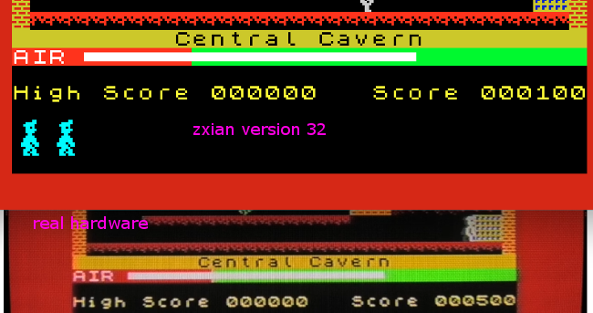 Manic Miner has run significantly faster than intended on zxian version 31 and earlier. In this image, we can see how much more the AIR level has decreased without contention, comparing two games started at the same time, but in versions 31 and 32.